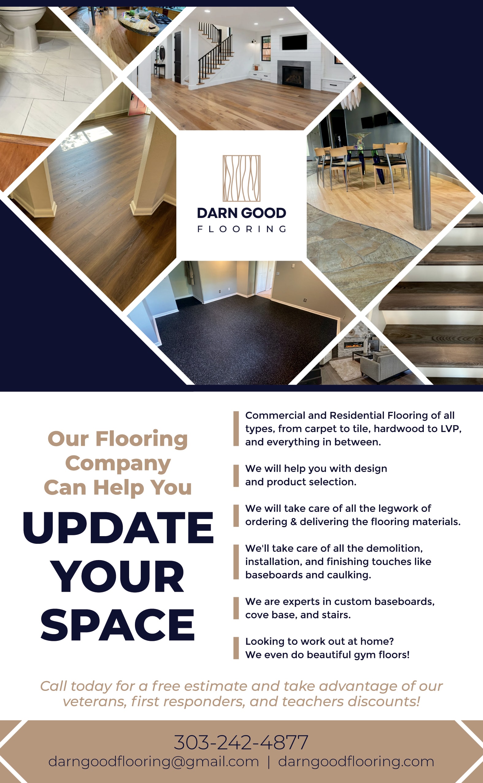 Darn Good Flooring is a locally-owned flooring supplier and installer. We handle all types of flooring in both residential and commercial settings. With all five-star reviews, it's clear that we put our customers first and strive to give first-class service. In addition to the typical flooring solutions like Carpet, Hardwood, Luxury Vinyl Planks, and Tile, we also specialize in Rubber Gym flooring. Call today and we look forward to guiding you through the entire process from design to installation.